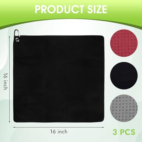 PEASUG 3 Pack Golf Towels (16″ x 16″), Absorbent Waffle Pattern Golf Towel for Golf Bag, Tri-Fold Portable Microfiber Golf Towels for Men & Women with Carabiner Clip, Gray/Red/Black