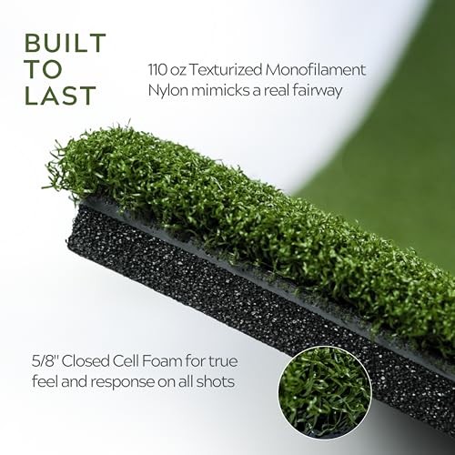 REALISTIC FAIRWAY SIMULATION: With 110 ounces of nylon, this mat enables golfers to achieve that coveted Down-and-Through motion, replicating the experience of a genuine fairway. Dense nylon fibers, coupled with the 5/8” closed cell foam pad, deliver authentic feedback on all your shots, whether they’re fat, thin, or pure.