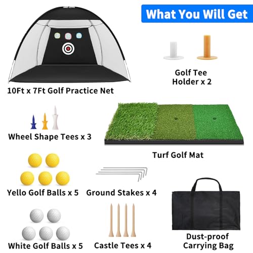 Golf Net: 10x7ft Golf Practice Net for Backyard Driving – All in 1 Golf Hitting Aid with Tri-Turf Mat Golf Net for Indoor Chipping Swing Training with Target/Balls/Tee/Bag