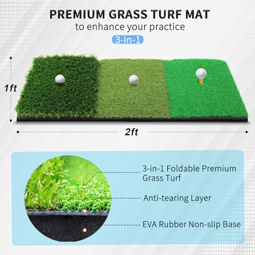 3 IN 1 Golf Mat: The multifunctional golf hitting mat is composed of three different lengths of grass, offering a variety of options for your swing, chip, and putt practice, and providing a realistic golf hitting experience. The bottom of golf hit mat is designed with non-slip PVC, which grips the ground more effectively to prevent slipping and movement during golf practice, offering better shock absorption and club protection for the best golf hitting experience