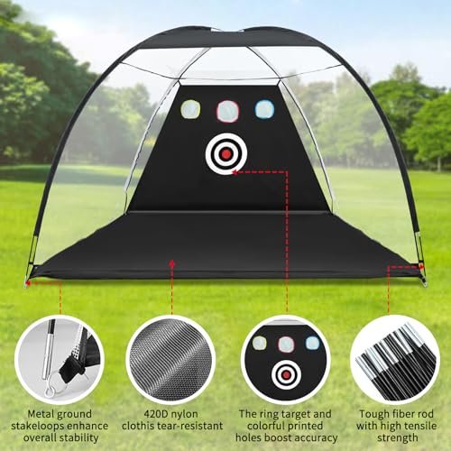 New Upgrade Material: Our resilient golf net is designed by seasoned golf and sports net experts, crafted from 420D Oxford fabric and 170 g nylon mesh, offering unmatched stability. The robust material allows it to effortlessly handle the impact of golf balls, providing a reliable barrier that effectively dampens noise and ensures safety during practice sessions. The 0.4-inch fiberglass poles secure the practice net, firmly grounding it for a stable and dependable setup