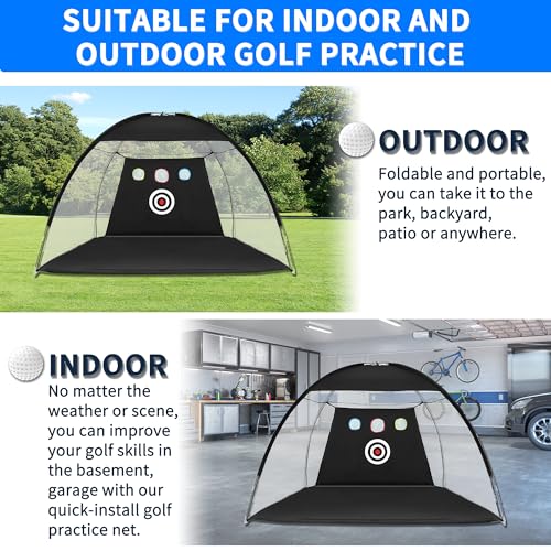 Easy Assembly and Portable: Our golf net is easy to assemble and disassemble, taking only 2-5 minutes to set up. The easy-to-install golf practice net saves your valuable personal time, giving you more time to enjoy indoor or outdoor golf games! You can easily set up the golf net in your backyard, basement, living room, indoors, or outdoors, and practice your skills anytime, anywhere. We also provide a storage bag, which is easy to transport and store when not in use and does not take up space