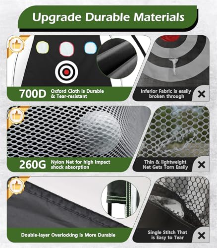 ใ๐Strong and Impact-Resistant MaterialsใOur golf net is made of 700D Oxford cloth, 260g high-density net and 0.45-inch thick reinforced fiberglass structure,which has excellent durability and impact resistance. The strong material ensures that the training net can withstand the power of golf balls hit at a high speed of 200MPH without tearing or wearing out easily. You can achieve high-intensity driving ranges indoors and outdoors, release your passion and experience the fun of sports.