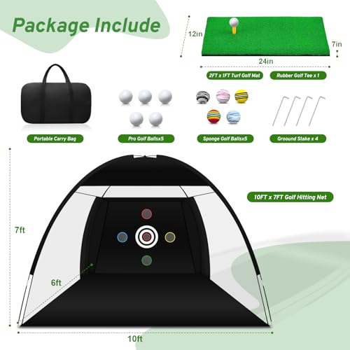 Personal Golf Driving Range:The large 10 x 7 ft golf net gives you plenty of room to practice your chipping and backyard driving. Four higher smaller targets allow us to refine our skills and hit the ball more accurately. Our golf hitting net also comes with 24 x 12 inch golf mats, 5 x golf balls, 5 x sponge balls, 1 x rubber ball holder, 1 x large capacity carry bag and 4 x ground stakes that you can use to complete all of your drills and improve your golf game!