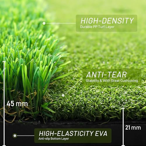 Premium Golf Mat – VIVITORY Golf Mat made of premium artificial turf and non-slip EVA bottoms. EVA pad thickness 10mm, rough turf 35MM, and fairway turf 11MM. The durable high-density dual turf gives you a realistic golf course hitting feel to provide a better experience. The high elastic bottom EVA non-slip rubber pad is suitable for all kinds of ground, providing you with better stability and support. Own professional training equipment and practice golf swing merrily!