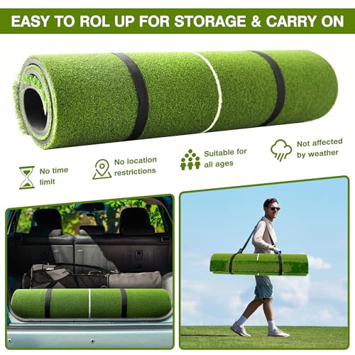 Complete Golf Mat Set – Includes a 5 ft x 4 ft golf mat, 10 golf balls, 7 golf tees, 3 golf rubber tees, and 1 carrying strap. Great for all ages – From Beginner to Advanced. With Vivitory golf swing mat, you can practice golf anytime anywhere outdoors and indoors. Whether in the backyard, garage, basement, office, club, or more, golf practice mats provide real hitting feelings and improve your game